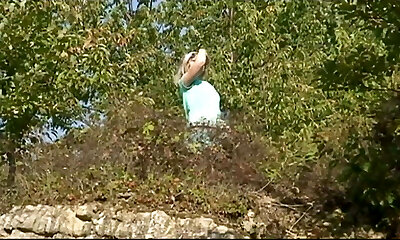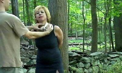An old German lady with dark hair gets her slit filled in the middle of the woods