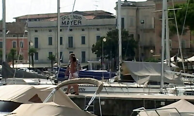 Superb dark haired damsel from Germany letting people play with her good-sized tits