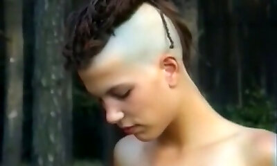 Skinny and tall punk damsel with two horny men in the woods